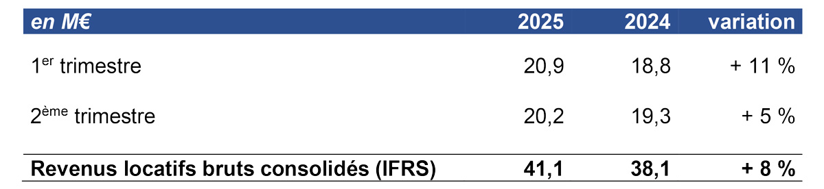 La légère baisse des revenus entre le premier et le deuxième trimestre 2025 est due à la tombée de garanties locatives (0,4 M€) et aux écritures IFRS16 d’étalement des franchises de loyer (0,5 M€).