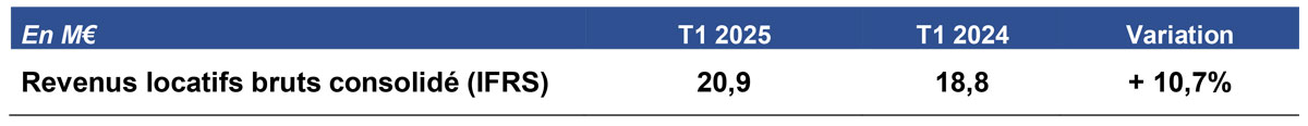 Les revenus locatifs bruts d’INEA au 1er trimestre 2025 s’élèvent à 20,9 M€, en progression marquée de 10,7 % par rapport à la même période de l’exercice précédent.